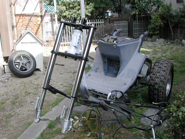 さて、キャノピーいじり再開で最初にカスタムする事にしたのが、前述のフロントブレーキのディスク化。車格を変えないようにする為、12インチで探してみました。そこで入手したのが、写真のフロントフォーク。これはスズキ・ストリートマジックです!