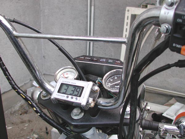 私は自宅仕事のせいもあって普段から腕時計をしません。バイクに乗る時、特に遠出をする時は時間が気になるものです。キャノにも時計が欲しいなぁ〜〜〜と思い、燃料計とスピードメーターの間を空けてあったのですが、三連メーターはついぞ完成せず…………ケン坊さんのXを見習ってデジタル時計を付けてみました。個人的には時間を『量』で認識する人なのでアナログ式の方が好みなのですが、機械式だと振動対策など皆無の100均時計はダメなようです。Xに装着した時計は壊れたまんま放ってあります(笑)