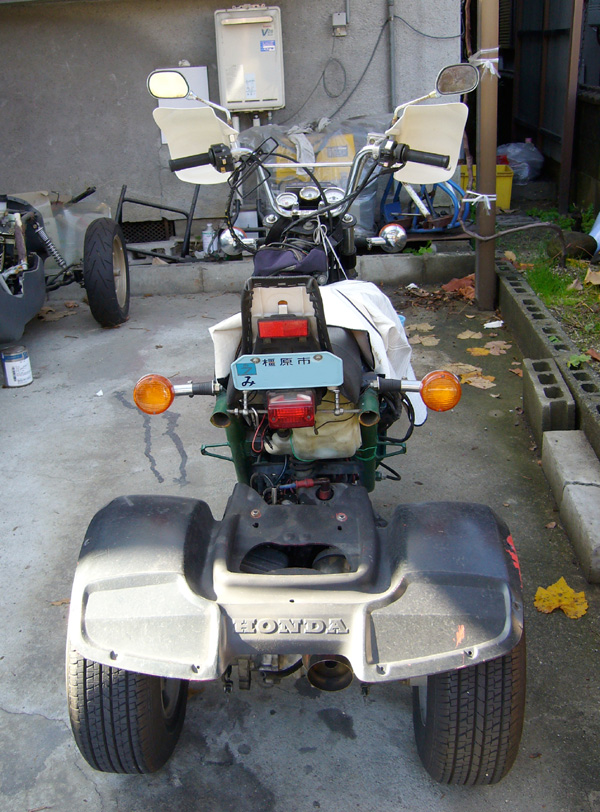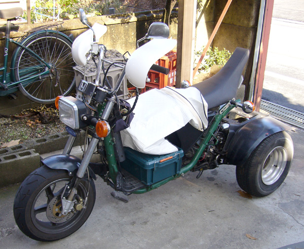 で、膝カバーを導入しました。とてもビジュアル的にはみっとも無いのですが、この機能部品はとてもよく出来ていましてコレがあるとGパンの下にインナーを必要としません。停車時に足を出しにくいですが、そこは三輪なんで足付きせずに静止する事もさほど困難なテクニックでは有りません。