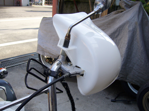 その次に購入したのが「ナックルガード」純正品は「ソフトプロテクタ」と言うと思うので別なメーカー品かと思います。機能的にはまったく同じものです。新聞屋さん等が愛用しているものですね。ハンドルカバーと違ってスッポリと手を突っ込まないので手の出し入れという煩雑さが有りません。其の分防寒性には劣るかも知れませんが風が当らないだけでも相当違います。小雨なら軍手でも手は濡れないでしょう。夏の日焼け対策にもなるかも知れません。それにハンドルカバーよりはスタイリッシュです(多少は………)