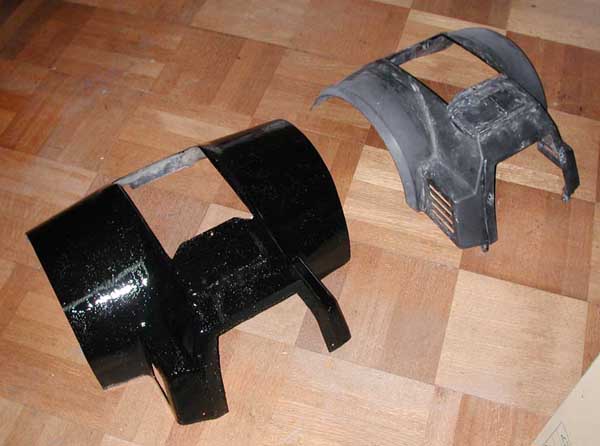 既存のエンジンカバーを兼ねたフェンダーの上から必要なはり出し分を塩化ビニールの板を買ってきて両面テープで固定します。次に隙間などを粘土で埋めながら形成してゆくのですが、プロはどんな粘土を使っているのでしょうか?メーカーのクレイモデルは削りながら仕上げるので、多分ブロンズ粘土だと思うのだけどそれが解らない素人はチープな油粘土を使いました。まず100円均一で簡単に手に入る事、油分なのでFRPを貼っても決して付かないので剥離が簡単な事……これが私の判断でしたが、油粘土の選択は間違いでした。いつまでたっても乾かない・固まらない(笑)造作時はとても良いのですが、その後の展開が良くなかったです。どんな粘土を使うのが良いのでしょうか???