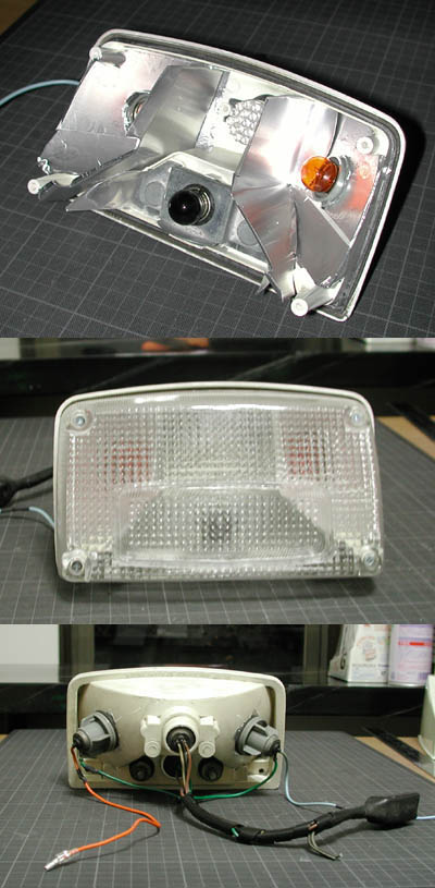 で、見つけました。SUZUKIセピアZZでした♪但しウィンカーでは無くて実体は『マーカーランプ』でした。早速取り寄せてみると内蔵するバルブは5Wの小さなものが入っていました。これではウィンカーとしての視認性に欠けます(+_+;)。本に載っていた車輌がこの点をどのようにしているのか不明ですが、私としては機能が著しく落ちるカスタムはたとえビジュアル先行でもイヤなんで、さらに手を加えます。まず別のミニウィンカーからソケット部を取り出し、カウルに直付けし、このZZマーカーランプからバルブ部をくり抜いたレンズ部をカバーとして使用します。これで23Wのしっかりした発光が得られました♪