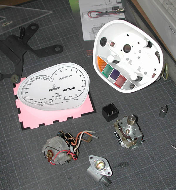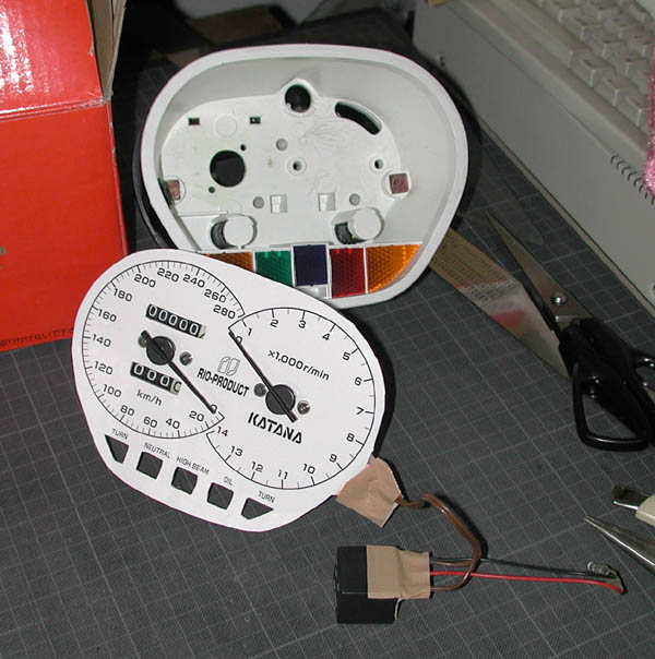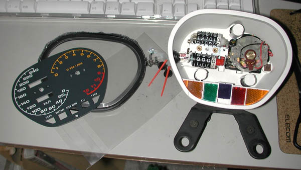 スピードメーターは280km/h、タコメーターは14,000回転まで刻んでみました。構造上タコメーターは12,000回転ちょっとしか針は動きませんが、どうせ10,000回転以上も回す事有りませんからイメージ先行でフルスケールにします。ノーマルの表示文字はちょっと大きいので文字は小さくして白場を広くとりました。