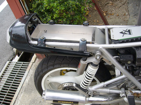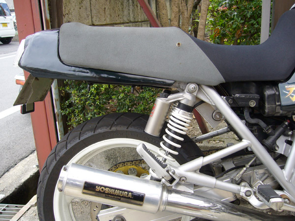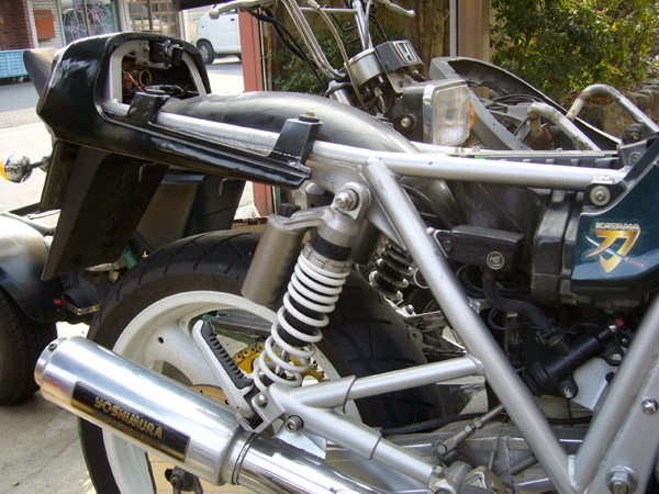 私のリア足回りは88GSX-Rがごっそり移植されています。スイングアームもロンスイになっていてホイールも18インチになっています。