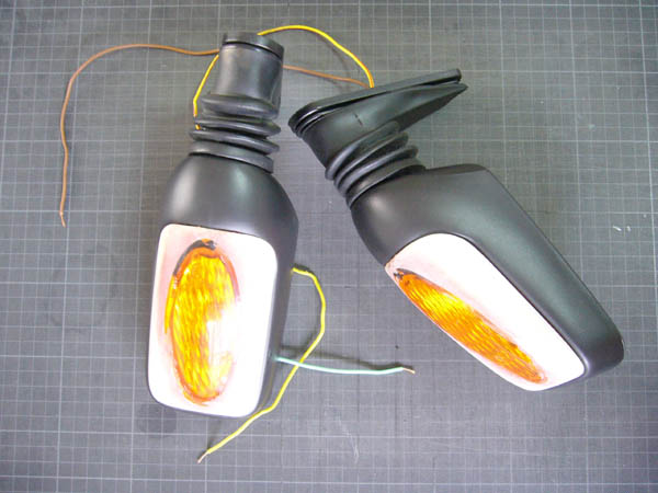 メッキのカバーを外してウィンカーのサイズと見比べながら穴を開けます。メッキはポロポロ取れますがいずれはボディーと同色にするので全部削り取ります。ウィンカーはヤマハのBJ(ベーシック・ジョグ)用。一番カーブの感じが似ていると思ったので毎度のヤフオク購入です。