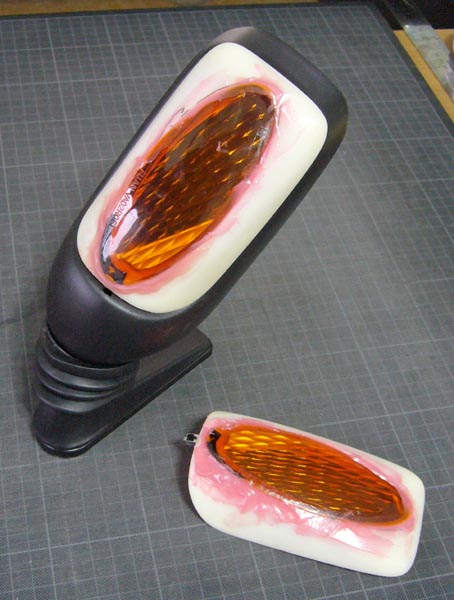 中に穴を空けてリフレクタ部を挟み込んでいます。配線作業等があるので完全には固定していません。カバー(レンズ部)で押さえ込んでいます、防水性には疑問が残りますが雨天時使用は毛頭無いですので駐車時に車体全体にカバーを掛ける事で大丈夫でしょう。カバーを掛けないとシートはまたネコのベッドになってしまいます!(>_<;)