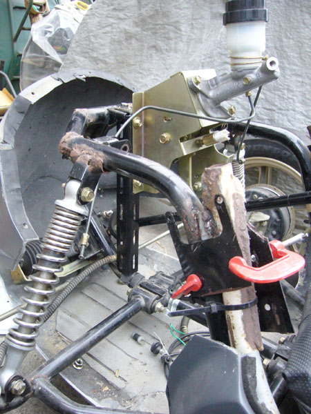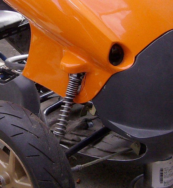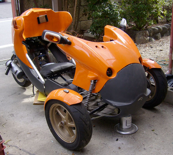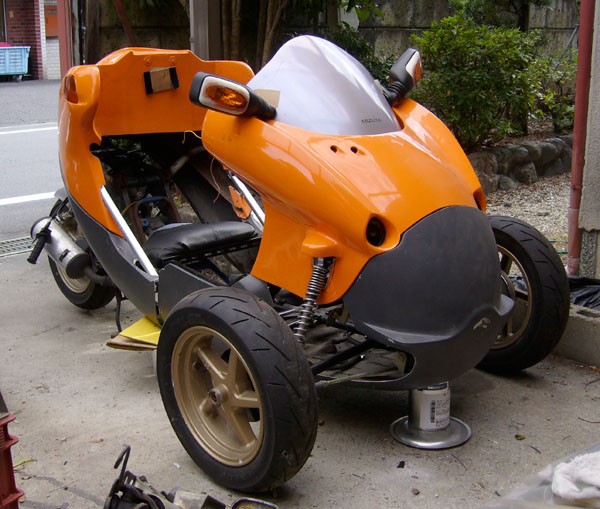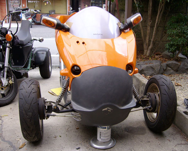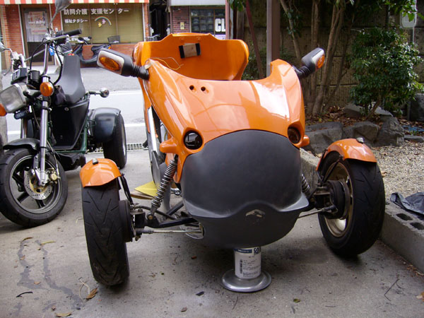 インパネを外して、ミラーはボディーの外側へ移動、実は頭の中の予想ではココには付けたくなかったのです。オレンジのアッパーボディーは以前にミラーを装着していた部分がすでに張出していますので、さらにそこから張出すのはデザイン上まずいんじゃないかと考えていました。しかし、実際に取付けてみると案外違和感有りません。耳がさらに大きくなり横にも広がった事で車体が低くなったようにさえ見えます。うん、コレで行くか!
