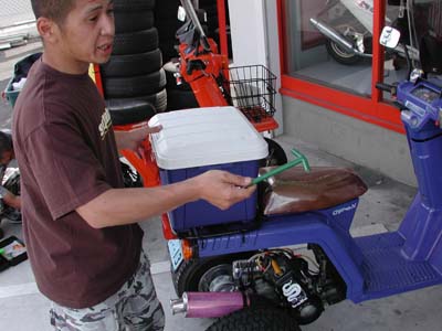 ケン坊さんのリアボックスからは次々と整備ツールが出てきます!プロ?いやいや本業は別にあるそうで…………