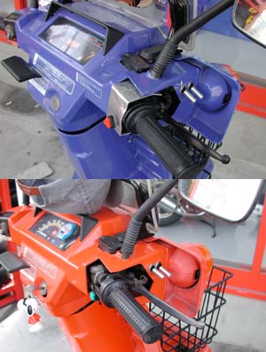ケン坊さんの車輌はリアサス下部に約3cmのカサ上げが施されています。通常はそのままだとケツ上げ状態となり、フロントキャスターが立ってしまって非常に乗りにくくなるのですが、フロントサスの内部にもゲタを履かせてステップ部が水平になるように調整されています。後方から見ると大変に背の高い乗車の印象を受けます。フロントサスの延長に伴い、ブレーキキャリパーのリンクアーム部の延長を溶接で施してある等、細かな配慮でカスタムされています。